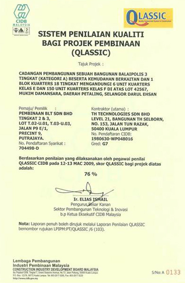 THP Bina Sdn Bhd was adjudged "Excellent" and achieved the highest QLASSIC score 2008-2009